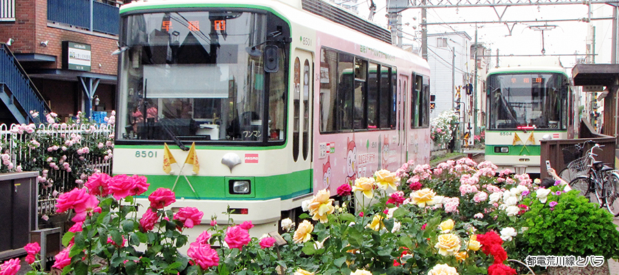 都電荒川線とバラ 日暮里南公園 あらかわ遊園 旧三河島汚水処分場喞筒場施設